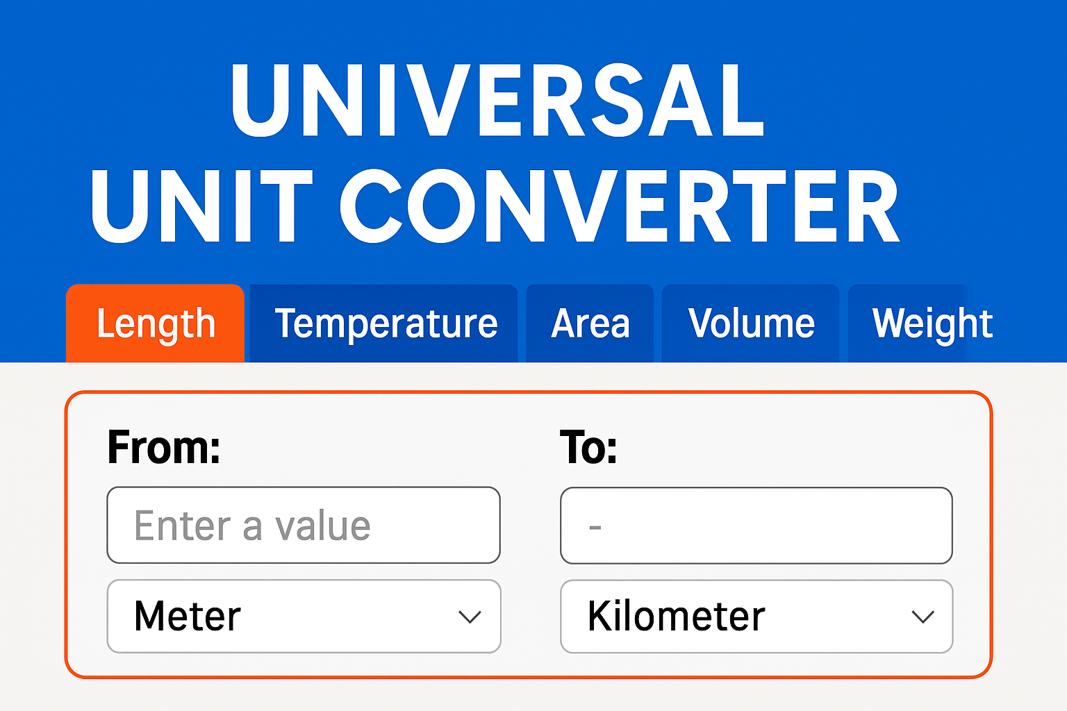 This Universal Unit Converter is the fastest and most user-friendly tool for converting Length, Temperature, Area, Volume, and Weight. Whether you’re a student solving math problems, an engineer calculating measurements, or a traveler converting distances, this tool saves time and delivers instant accurate results. Just enter your value, select the units, and get automatic real-time conversions — with smart scientific notation formatting.